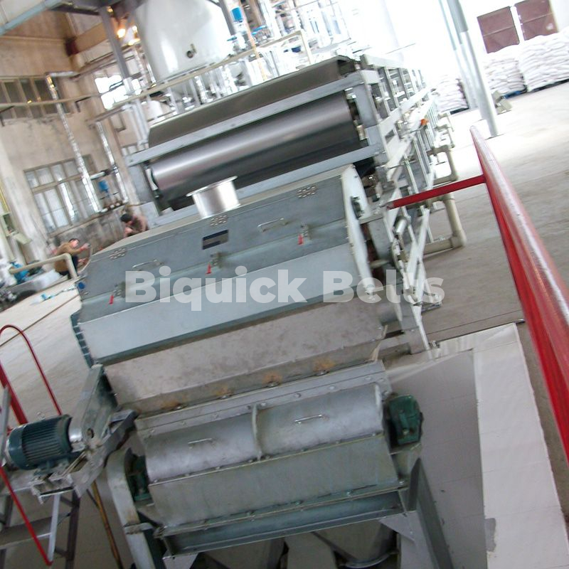 The stainless steel belt cooler consists of double rollers, stainless steel belt conveyor, flake material crusher, water spray cooling, and running gear. The hot-melt material extruded by the extruder is rolled into a 1-2mm thick strip by the rollers and cooled with water. During the conveying process, cold water is sprayed onto the back of the steel belt by nozzles, ensuring an even distribution of the cooling water, which allows the material to cool evenly into a solid state and break into flakes that fall into the material hopper. The cooling water does not come into contact with the substances in the cooling system. The uncontaminated cooling water can be recycled or discharged without causing environmental pollution.